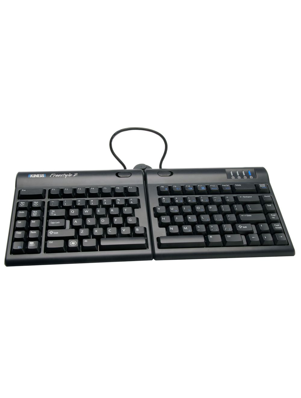 - Tastierino numerico integrato. È sufficiente premere il tasto "Fn" per passare dal tastierino numerico alla tastiera alfanumerica. Kinesis offre il tastierino numerico ergonomico opzionale Low-Force Keypad, con presa USB, per chi utilizza molto i numeri.
